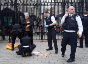 Dvoje kršćanskih prosvjednika uhićeno je danas na Downing Streetu nakon što su izlili lažnu krv i ostavili krvave otiske ruku na vratima. Virginia Moffat (58)
